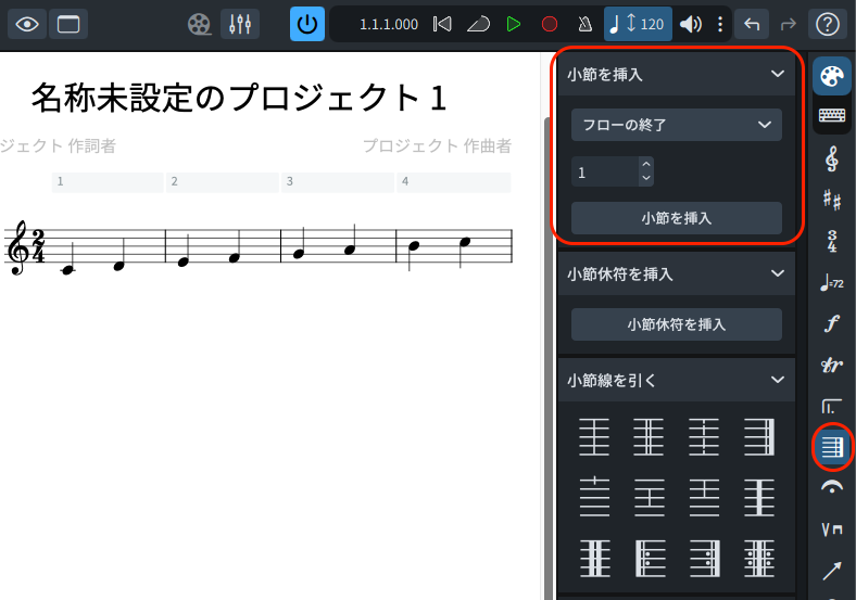 右ゾーンの「小節と小節線」パネルに「小節を挿入」という機能があります。小節を追加する方法は後述するようにいくつかあるのですが、これが一番わかりやすいでしょうか。