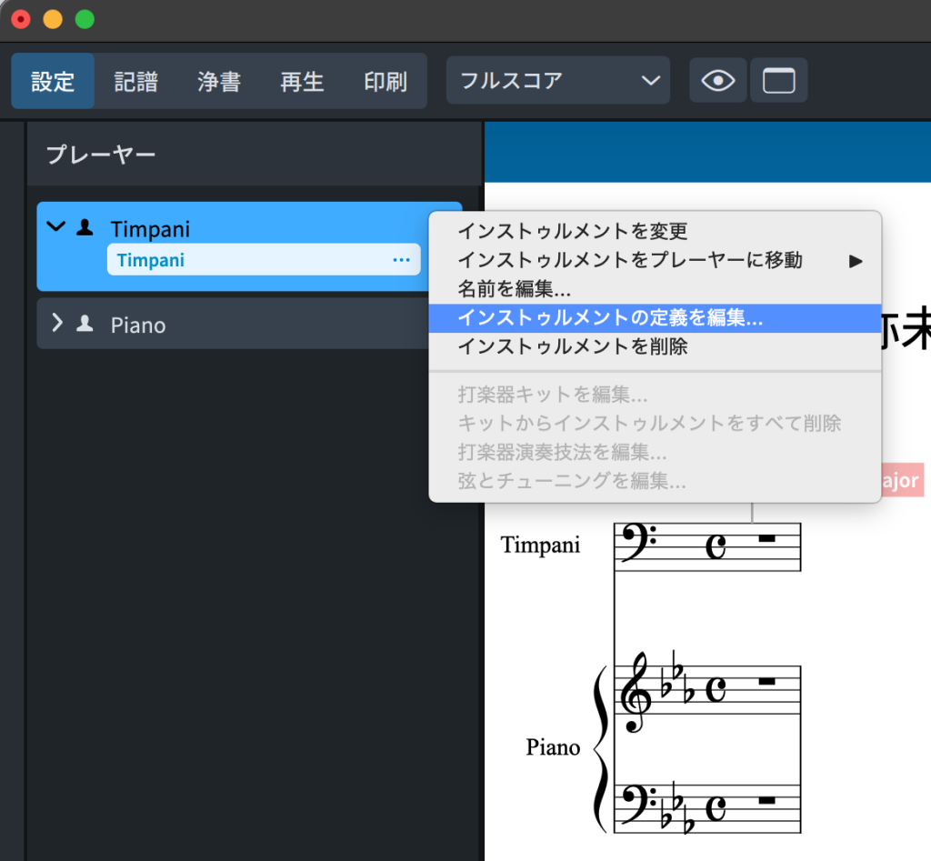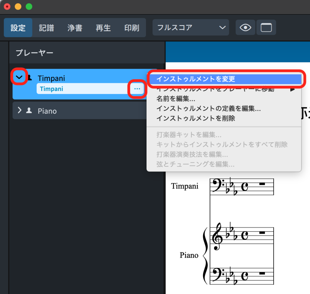「設定」モードの「プレーヤー」パネルで、Timpani(プレーヤー)の中にあるTimpani(インストゥルメント)の「…」をクリックし、「インストゥルメントを変更」を選択します。