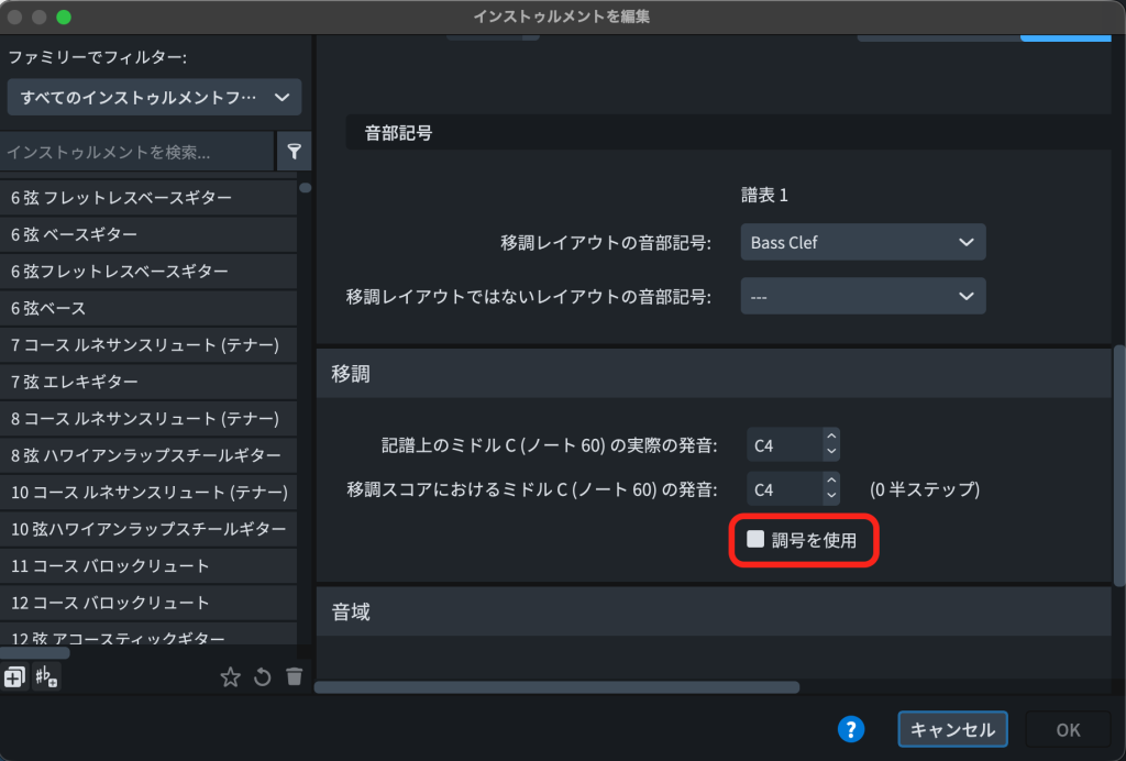「インストゥルメントを編集」ダイアログの中ほど、「移調」セクションに「調号を使用」というチェックボックスがあります。