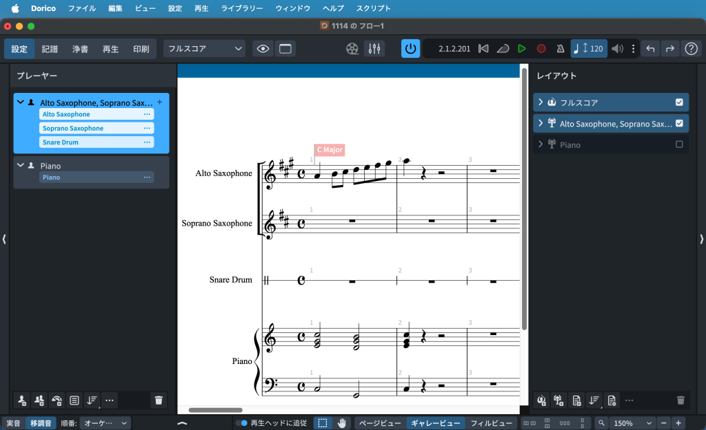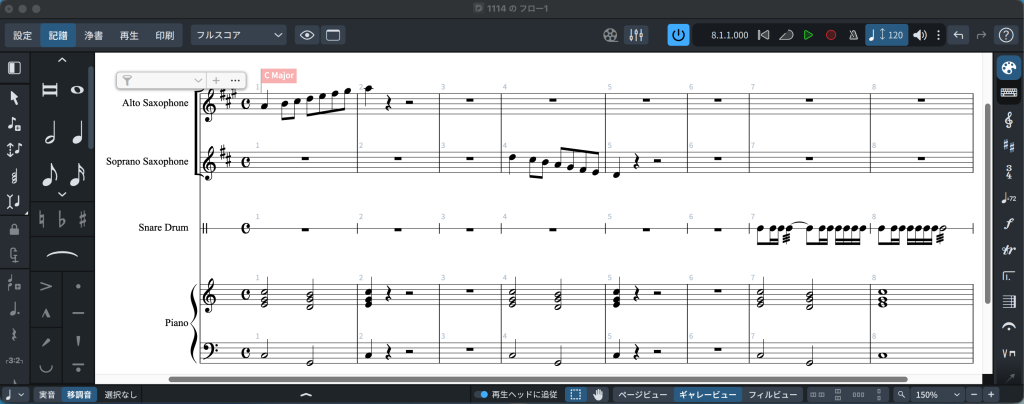 今回はアルトサックス(in E♭)からソプラノサックス(in B♭)、さらにスネアドラム(1線譜)に持ち替える指示を含む楽譜を作成してみます。