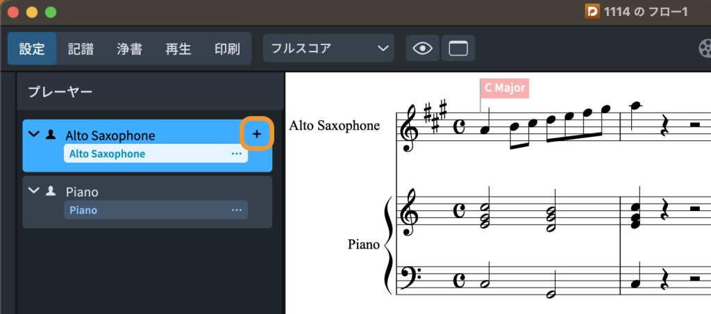 次に、アルトサックスのプレーヤーに別の楽器を持たせたいので、カード右上の「+」をクリックします。