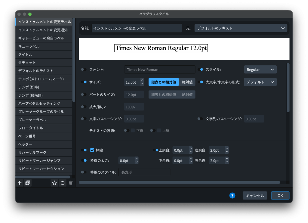 Doricoではこういった文字列のフォントやスタイルはパラグラフスタイルで管理しています。