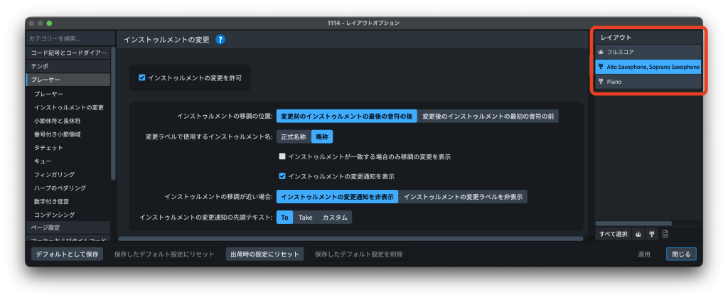「レイアウト」メニュー▶「レイアウトオプション」▶「プレーヤー」カテゴリー▶「プレーヤーの変更」に「インストゥルメントの変更通知を表示」というチェック項目があります。