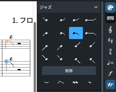始点と終点の音符を選択したら、[Shift]+[O]キーで「装飾音」ポップオーバーを開きます。