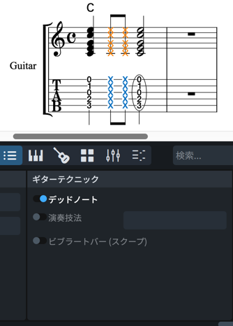 「ギターテクニック」パネルの「デッドノート」をオンにすると、符頭を「X」になります。