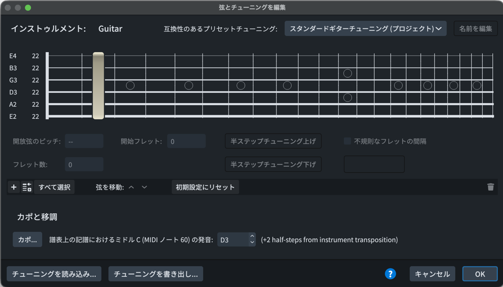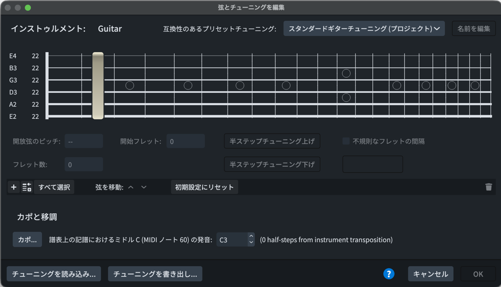 「弦とチューニングを編集」ダイアログでも実際のフレットを模して表示されるので、視覚的にもわかりやすいですね♪