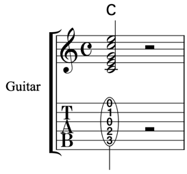 ここでは五線やコードネームは実音で表示されていますが、移調表記にする場合は「弦とチューニング」ダイアログの「譜表上の記譜におけるミドルC(MIDIノート60)の発音」を指定します。