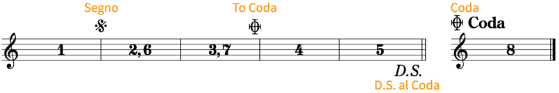- D.C. al Coda:冒頭へ戻って、To Codaでコーダへ飛ぶ