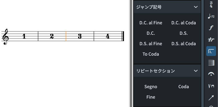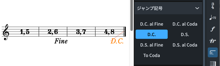 4小節目の後ろの小節線を選択し、今度はパネルのジャンプ記号の中のD.C. al Fineをクリックします。