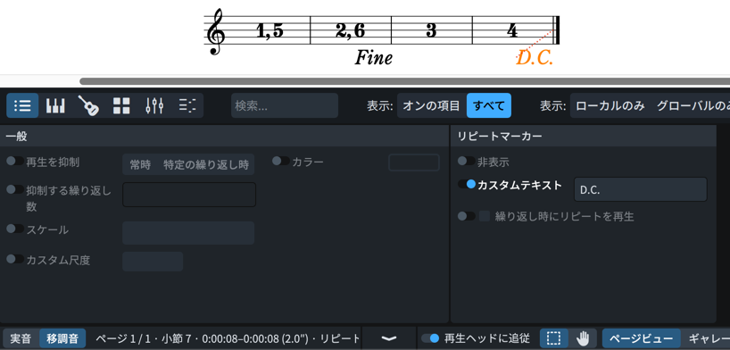 これで完了ですが、入力されたD.C. al Fineを選択し、プロパティパネルの「リピートマーカー」グループにある「カスタムテキスト」をオンにして「D.C.」に変えることもできます。