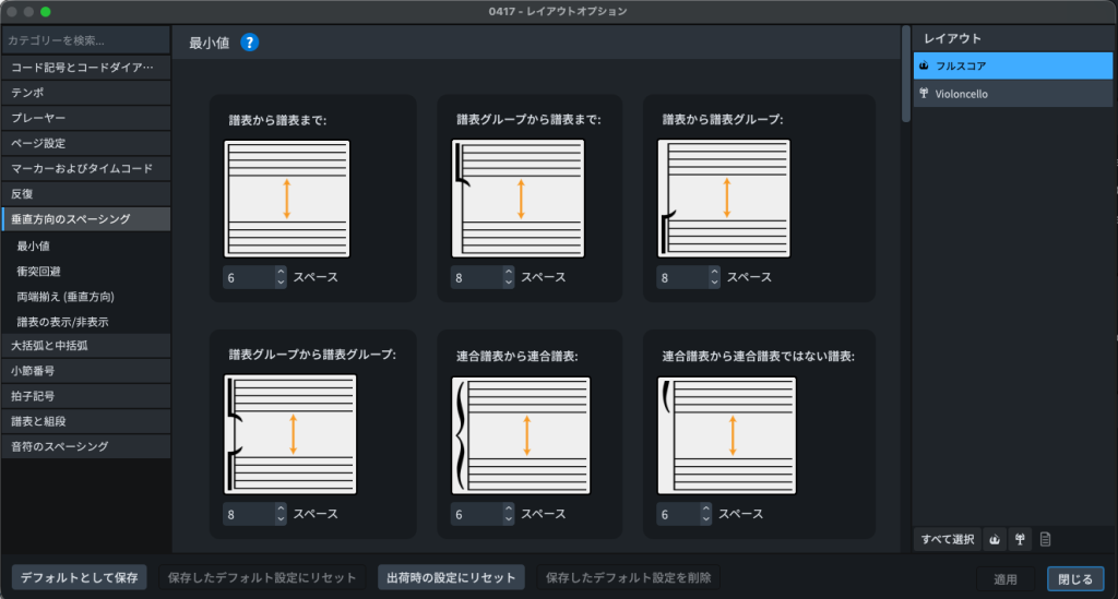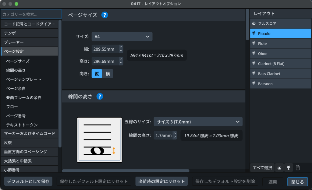 レイアウトオプションを開くと、ダイアログ右側で設定対象とするレイアウト(フルスコアやパート譜)を選択することができることがわかります。