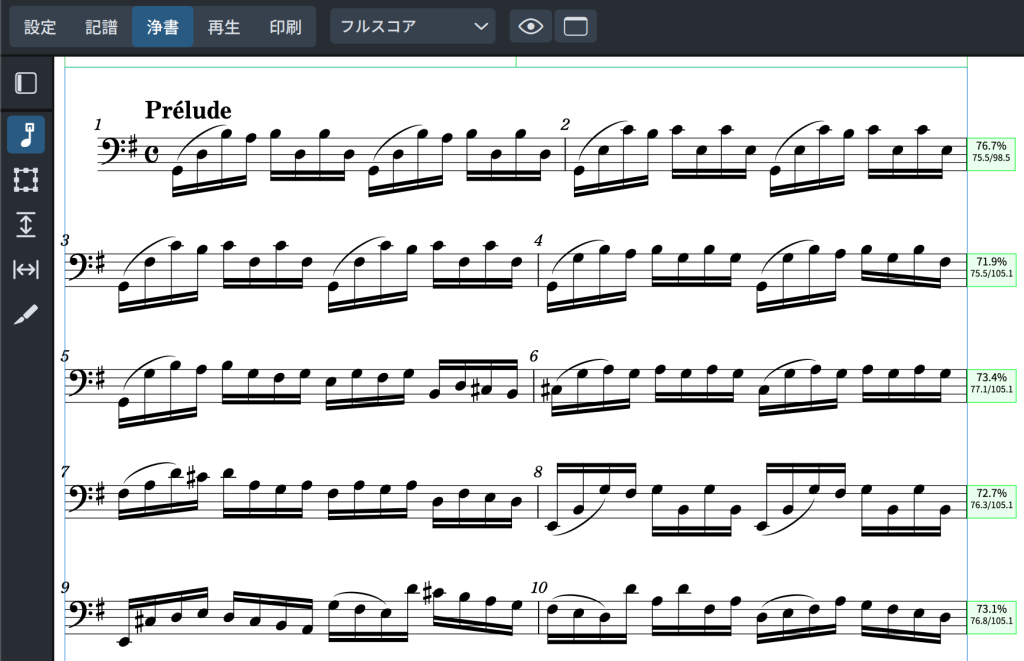 この差を表わすのが、浄書モードで組段の右側に表示されている「○○.○%」という割合です。これがスペーシングの密度を表わしているのです。