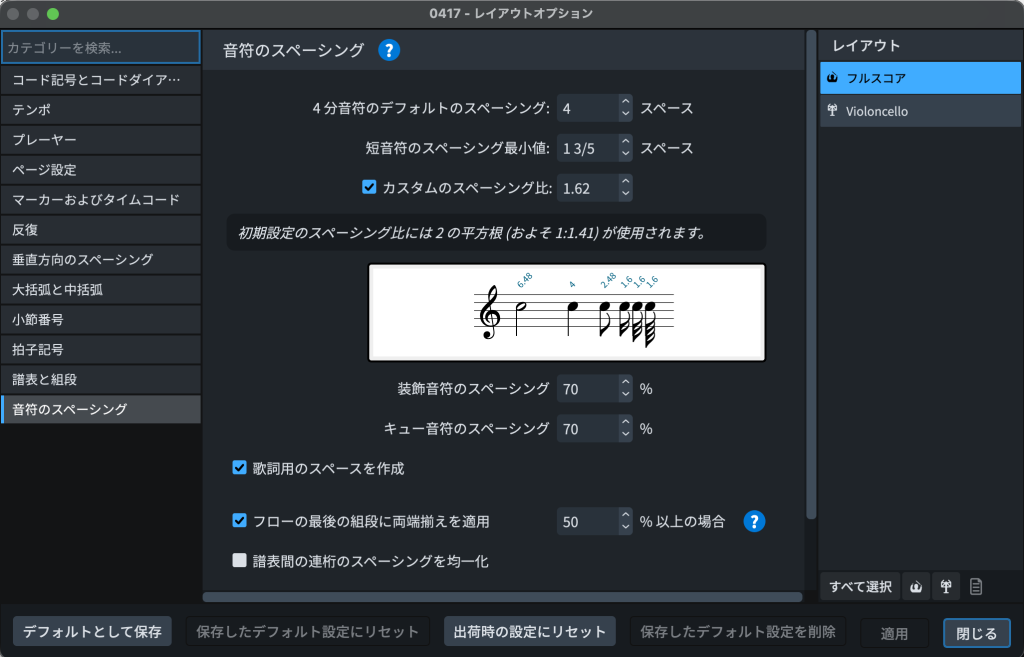 「4分音符のデフォルトスペーシング」が楽譜の密度を決定します。