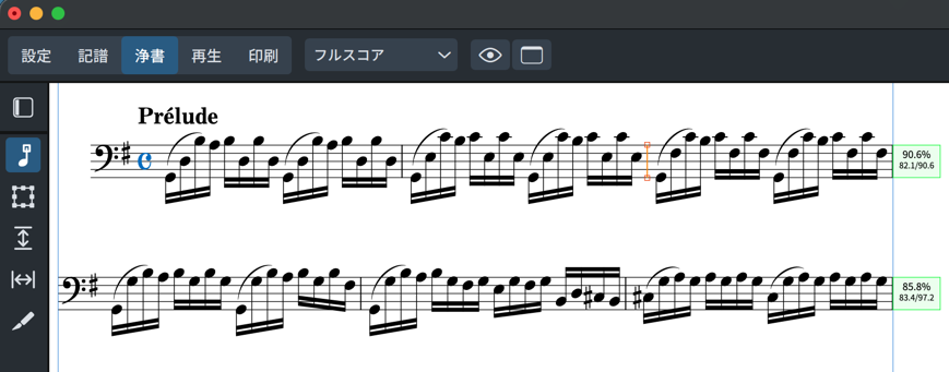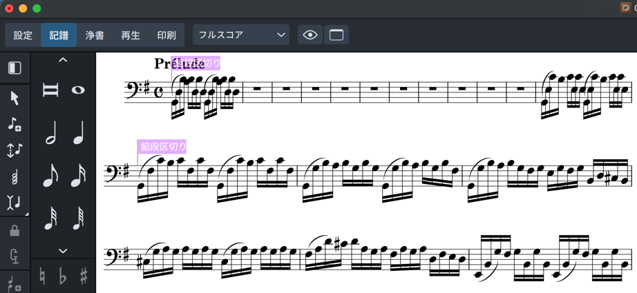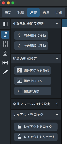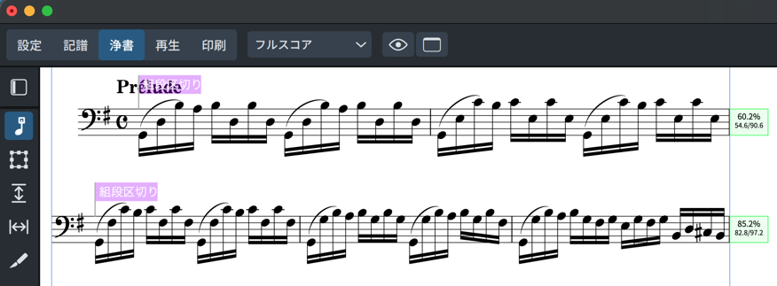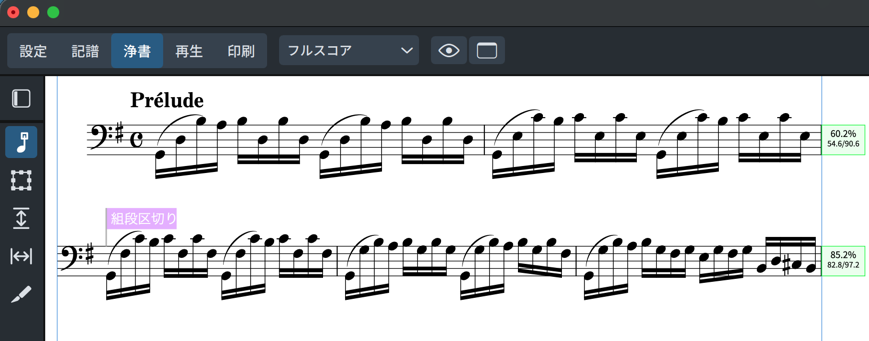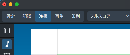 今回は楽譜の意味(音高やリズム)を変更せずに、楽譜の配置・見た目(グラフィック)を調整するので、すべて浄書モードで操作します。