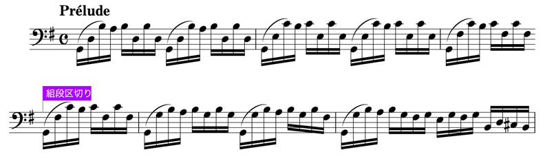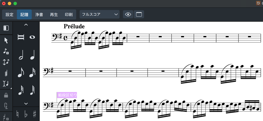 曲想が大きく変わるなど、ずばり「ここで改行したい!」という箇所では組段区切りを作成([Shift]+[S])だけを使用します。