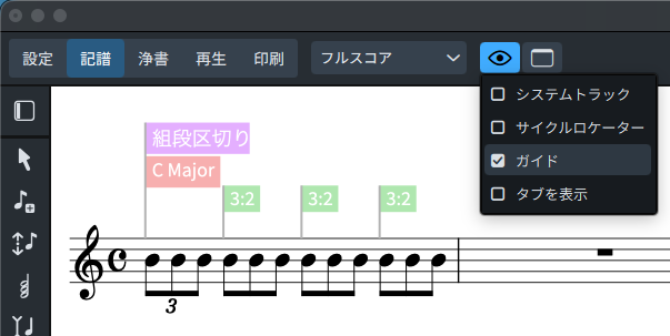 ハ長調・イ短調の調号や、省略された3連符など、楽譜上に表示されないアイテムや変更を示すのがガイドです。今回このガイドが鍵となるので、あらかじめ表示しておきましょう。