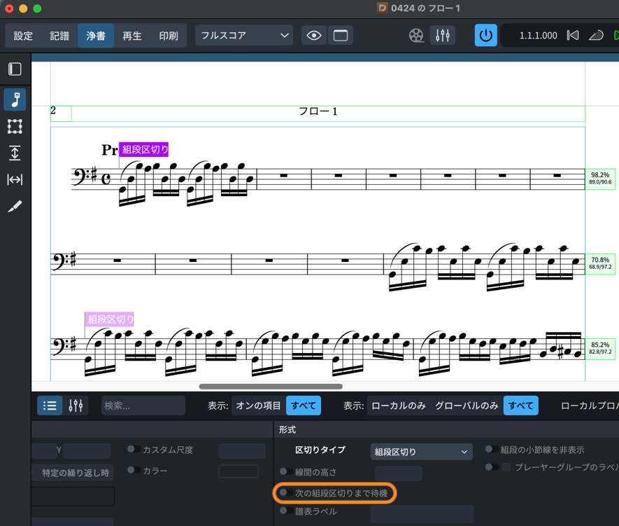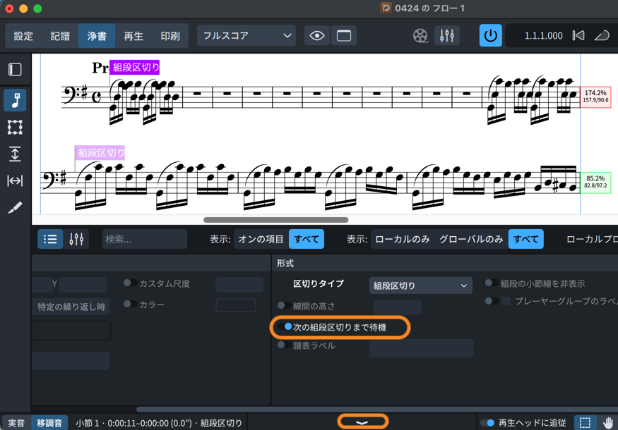 冒頭でお示しした画像のように楽譜がぐちゃっとつぶれてしまったときは、この「次の組段区切りまで待機」がオンになっているはずです。