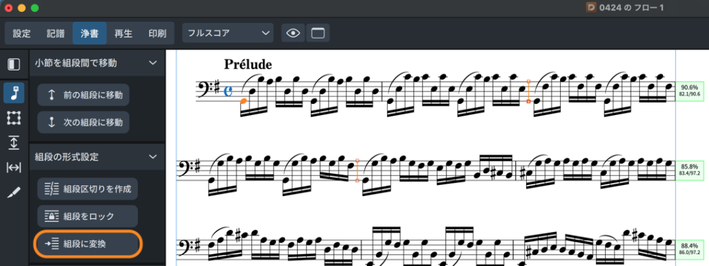 いっぽう、「前/次の組段に移動」「組段に変換」をしたあとで小節を挿入すると……