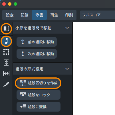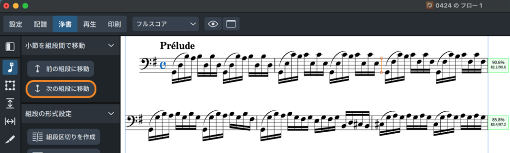 「組段区切りを作成」の代わりに「小節を組段間で移動」の「次の組段に移動」をクリックすることでも、