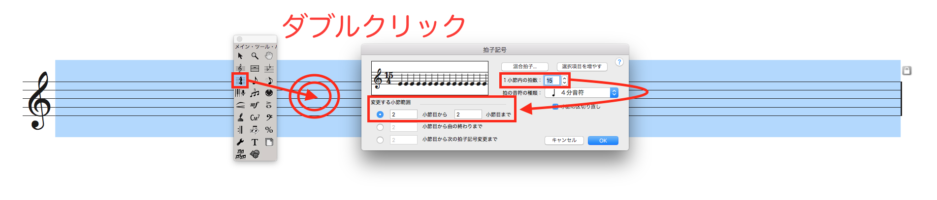 次に、[メイン・ツール・パレット]から[拍子記号ツール]を選択し、カデンツァを入力する小節をダブルクリックします。