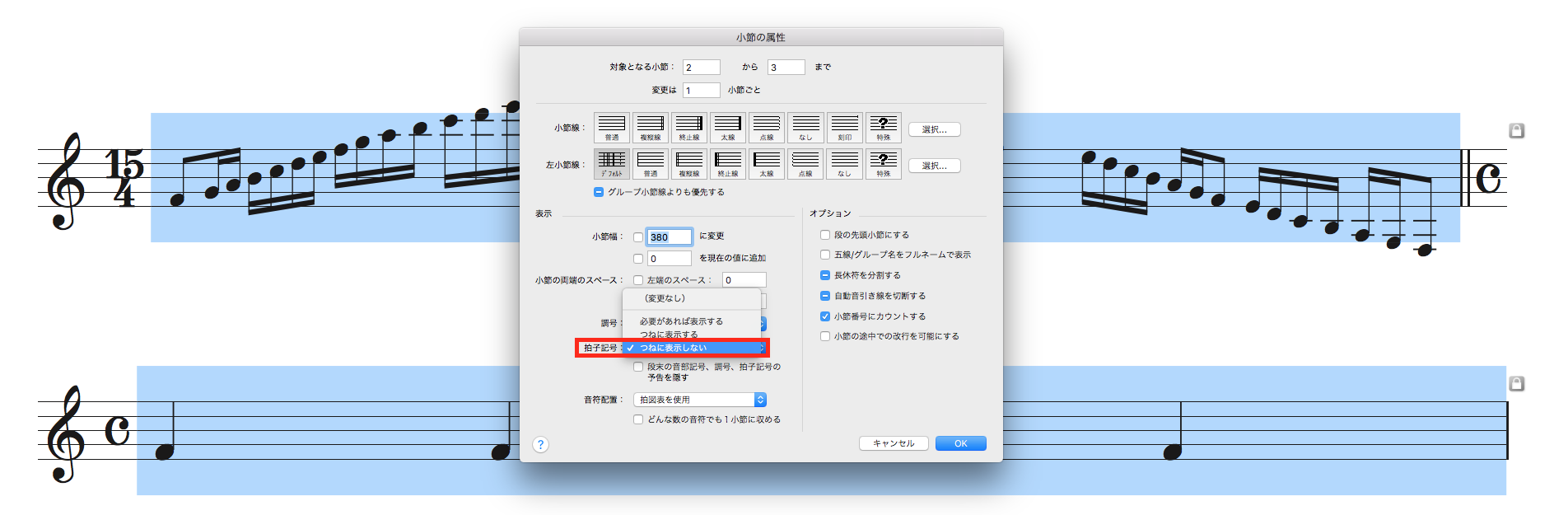 すると、[小節の属性]画面が表示されますので、[拍子記号]リストから[つねに表示しない]を選択し、[OK]します。