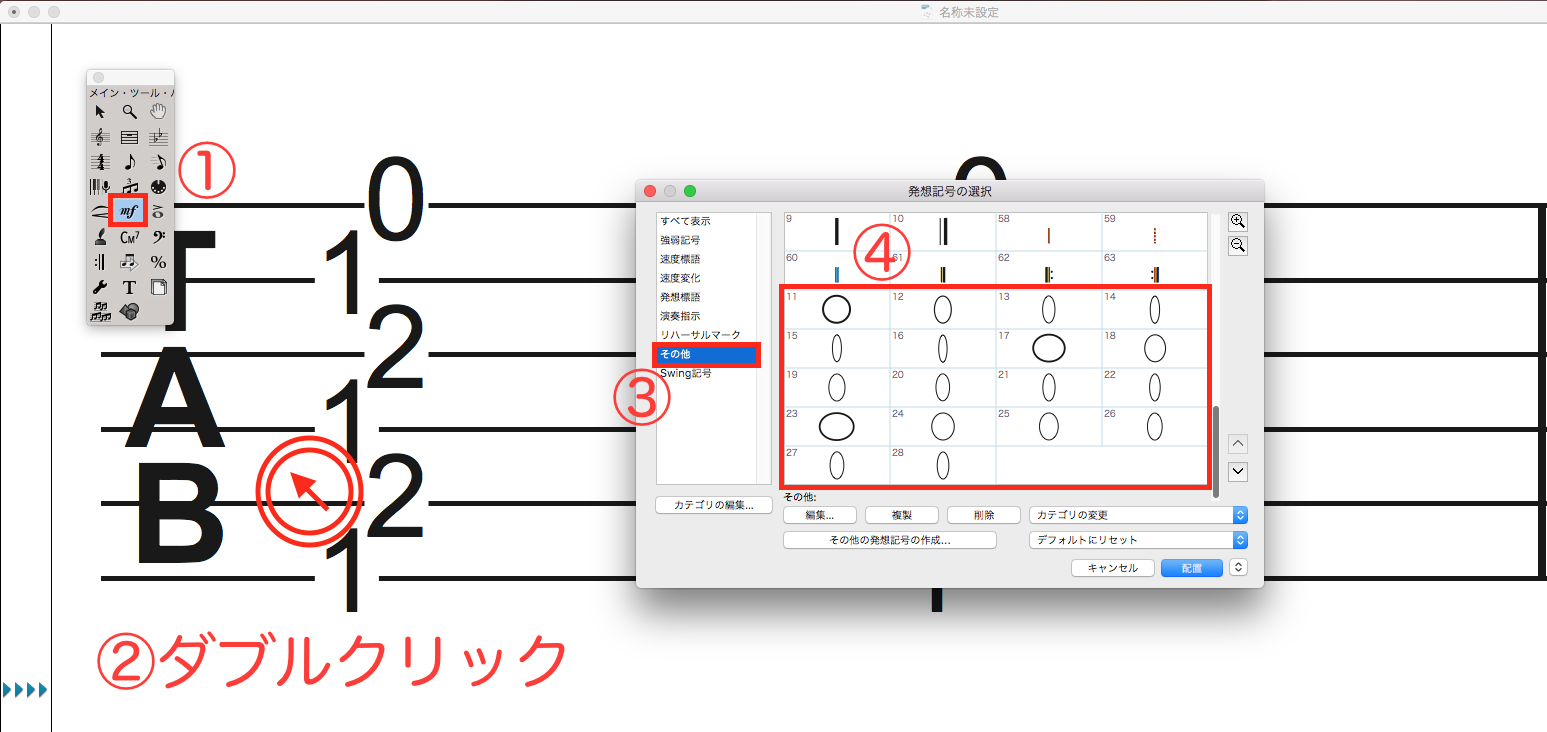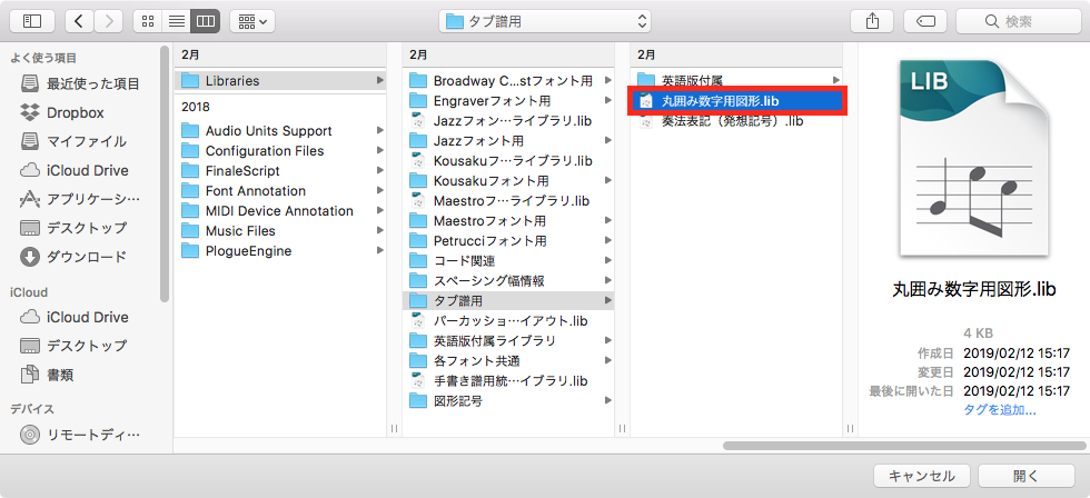 表示された画面から、[Libraries] ▶︎ [タブ譜用] ▶︎ [丸囲み数字用図形]を選択します。