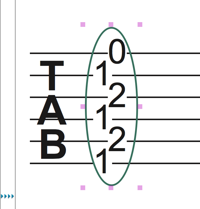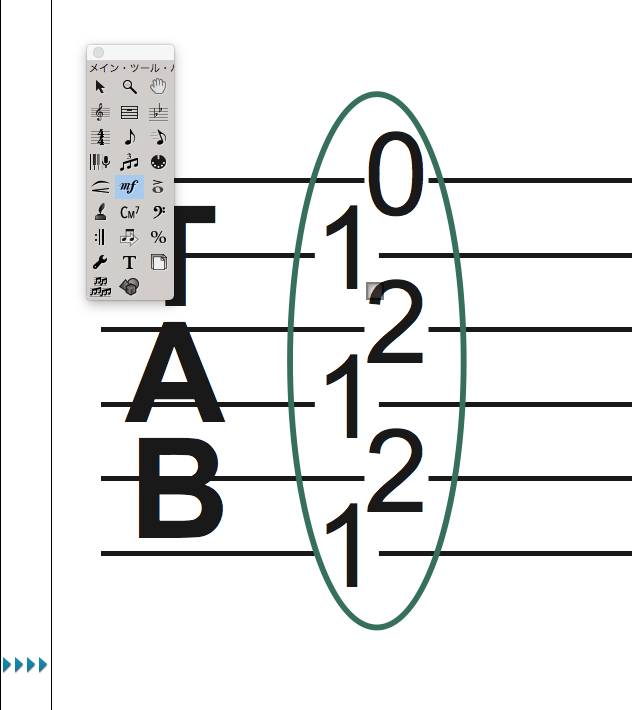 2分音符や全音符など4分音符よりも長い音価をもつ音は、タブ譜上ではフレット番号を丸で囲むことによって記されます。