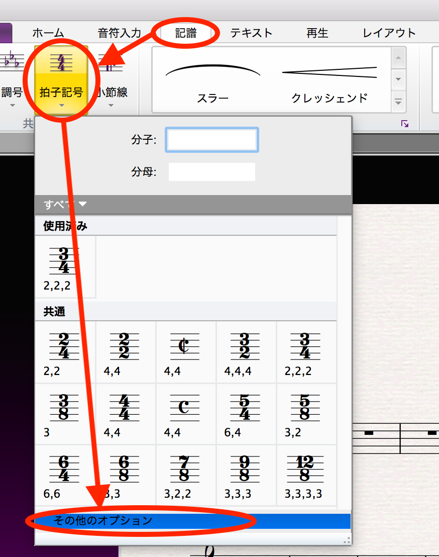 1.「記譜」タブの「拍子記号」から「その他オプション」を選択する
