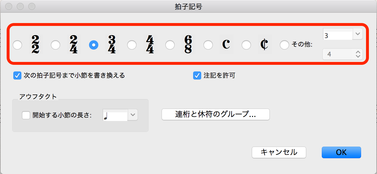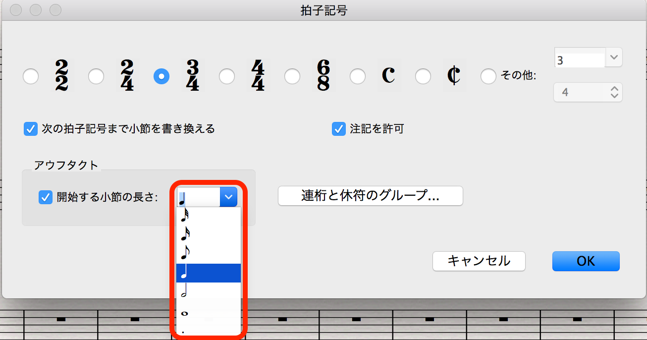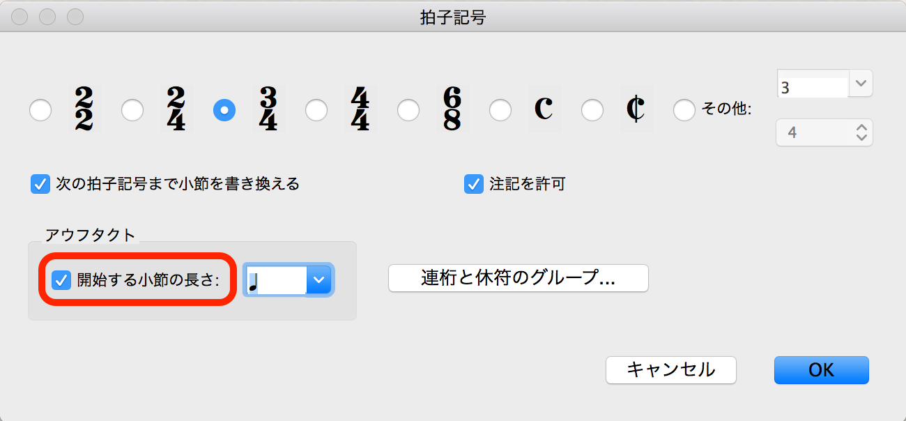 2. 拍子記号を設定した上で、「アウフタクト」欄にチェックを入れる