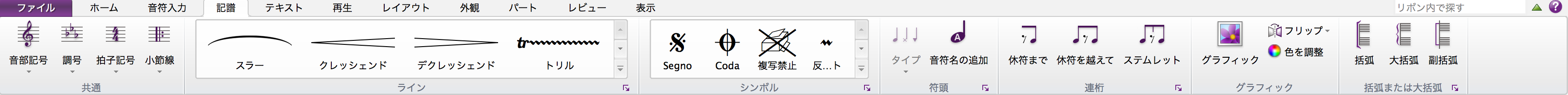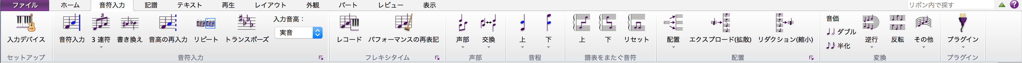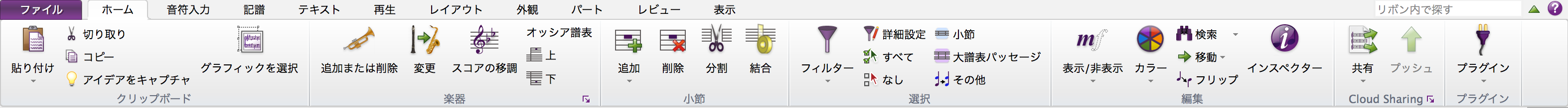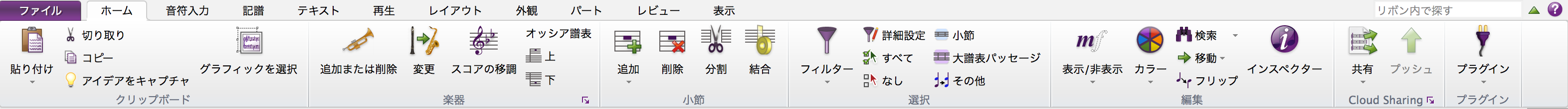 SibeliusはMicrosoft Officeでおなじみのリボンインターフェイスを採用しており、上部メニューで各機能を選択すると、ツールバー部分が選択した機能に対応する形で切り替わります。