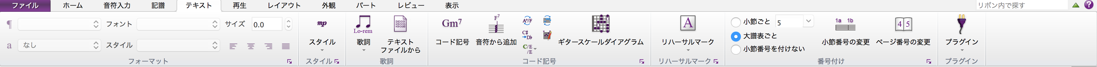 こちらも楽譜入力の際頻繁に使う機能です。主に楽譜のテキストを扱います。発想記号、テクニック記号、タイトル、リハーサルマーク、歌詞、コードネーム、ページ番号、小節番号の入力や、テキストの書式を設定することができます。